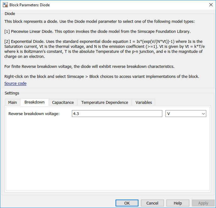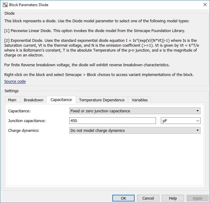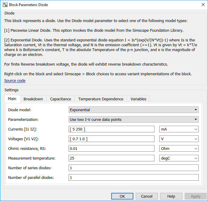 В примере 1 используется кусочно-линейная аппроксимация экспоненциального соотношения ток-напряжение диода. Это приводит к более эффективному моделированию, но требует некоторых размышлений, чтобы перейти к установке значений параметров блока. Альтернативой является использование более сложной модели, которая действительна для более широкого диапазона значений напряжения и тока. В этом примере используется Exponential параметр параметризации диодного блока.