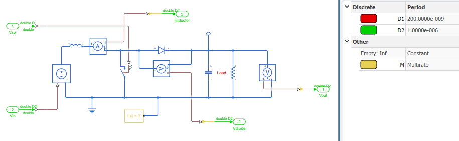 В этом примере модель повышающего преобразователя используется для иллюстрации изменения времени выборки в созданной модели реализации HDL и коэффициента избыточной выборки, который сохраняется в модели.