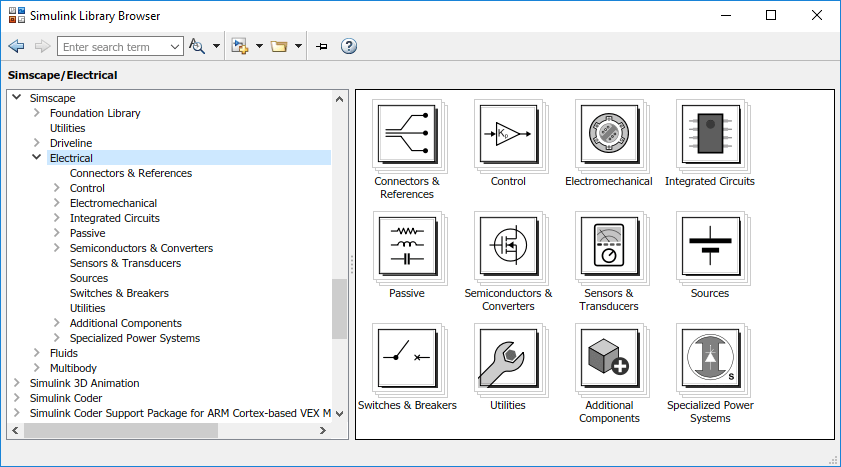 Чтобы отобразить библиотеку Electrical в браузере библиотеки Simulink, выполните прокрутку до узла Simscape. Разверните узел Simscape, а затем узел Electrical. В качестве альтернативы в командной строке MATLAB введите эту команду.