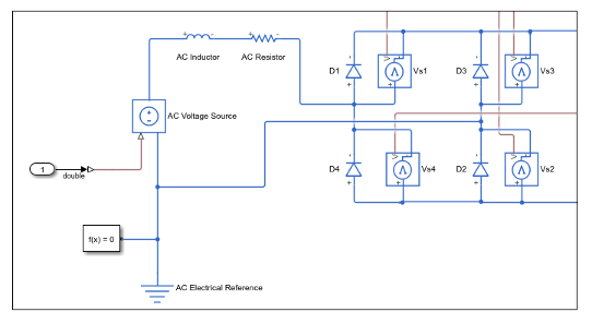 Внутри Simscape_system, вы видите четыре диода, расположенных в конфигурации моста. Как для положительных, так и для отрицательных входных значений эта конфигурация обеспечивает положительный выпрямленный выходной сигнал.