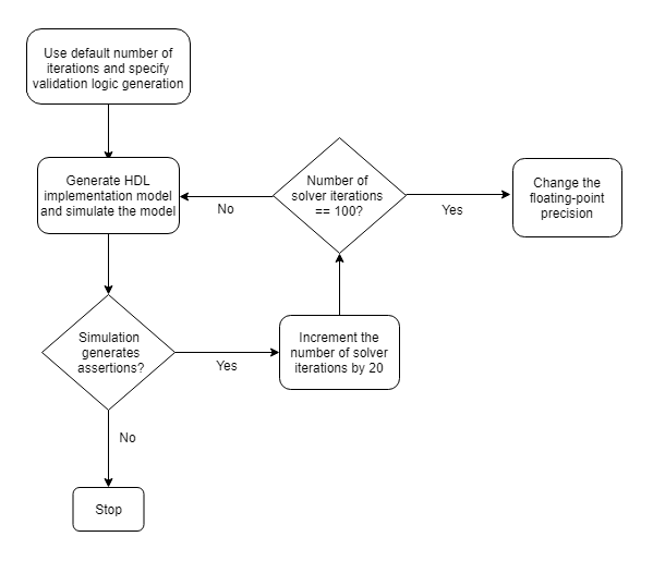 Помощник по умолчанию выбирает оптимальное значение для числа итераций решателя. См. раздел Использование числа итераций решателя (кодер HDL). Если увеличение значения допуска не улучшает точность модели реализации HDL, можно устранить числовое несоответствие, увеличив число итераций решателя.
