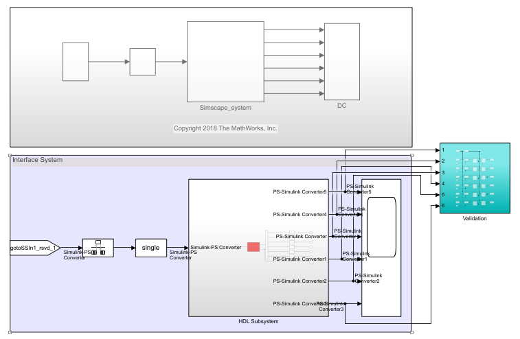 Щелкните ссылку, чтобы открыть модель внедрения HDL. Вы видите Validation Подсистема, сравнивающая результаты моделирования модели Simscape с моделью реализации HDL. Моделирование модели внедрения.