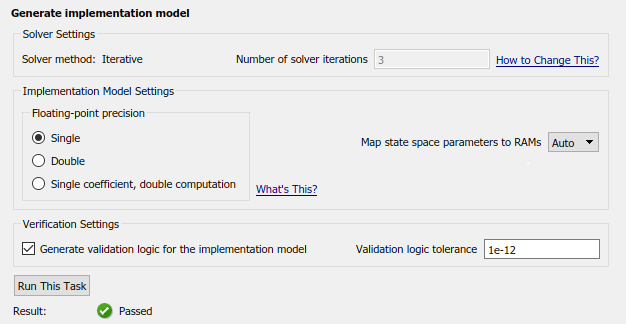 Можно использовать параметр Точность с плавающей запятой (Floating-point precision) в задаче Создать модель реализации (Generate implementation model), чтобы указать тип данных с плавающей запятой, который требуется использовать для алгоритма внутри HDL Subsystem. Укажите, следует ли сохранять коэффициенты матрицы в single или double типы данных и необходимость использования single или double при выполнении вычислений.