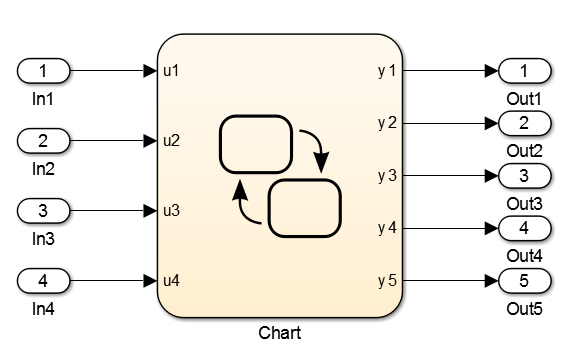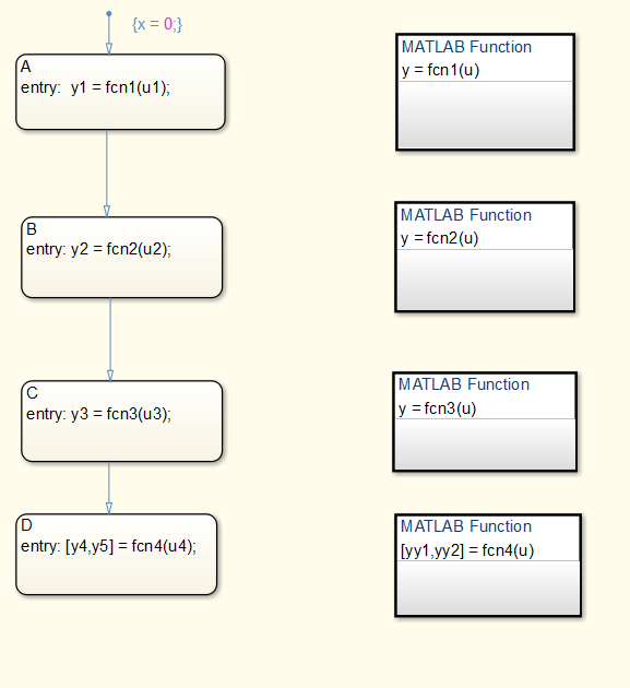 Следующий простой пример иллюстрирует различные случаи. Используемая здесь модель имеет диаграмму Stateflow ®, которая содержит четыре функции MATLABfcn1 кому fcn4.