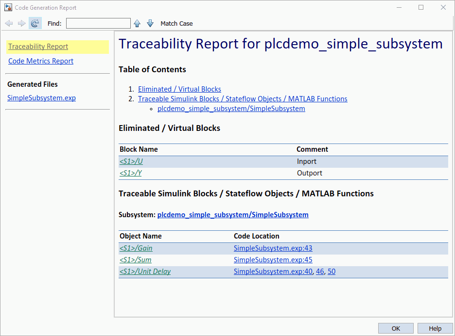Нажмите «Создать код ПЛК», чтобы инициировать создание кода и отчета. Кодер создает HTML-файлы отчетов как часть процесса создания кода. Откроется отчет HTML.