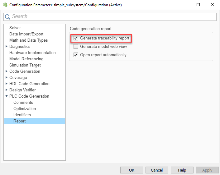Произведите отчет о генерации объектного кода Simulink® PLC Coder™ при помощи диалогового окна Configuration Parameters: