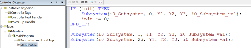 Дважды щелкните значок MainRoutine узел дерева и введите код в изображении. Заявление Subsystem(i0_Subsystem, 23, Y1, Y2, Y3, i0_Subsystem_val) вызывает метод регистрации (ssmethod value=23) для входа в систему i0_Subsystem_val тег.