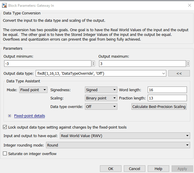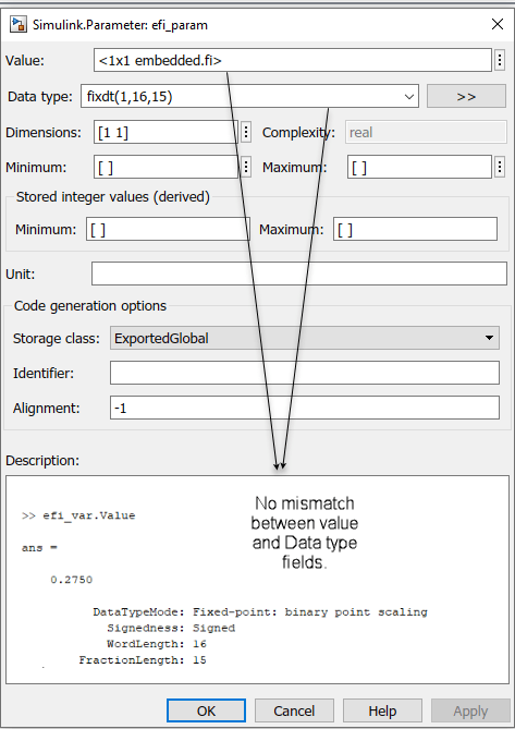 Тип данных и тип значения должны соответствовать настраиваемым параметрам типа с фиксированной точкой Simulink.Parameter.