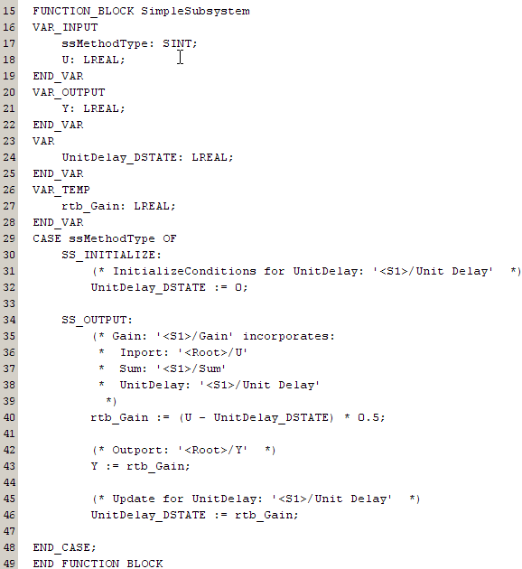 После создания кода его можно просмотреть в редакторе MATLAB. Описание того, как созданный код для компонентов Simulink сопоставляется с компонентами структурированного текста, см. в разделе Основы создания кода ПЛК. Кроме того, следует отметить следующее: