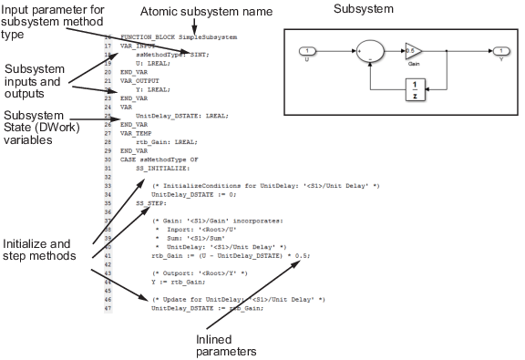 На следующем рисунке показано сопоставление сгенерированного кода с компонентами структурированного текста для простой подсистемы Simulink. Подсистема Simulink соответствует функциональному блоку Structured Text, Subsystem.