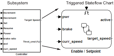 На следующем рисунке показано сопоставление сгенерированного кода с компонентами структурированного текста для запускаемой подсистемы Simulink. На первой части рисунка показана подсистема контроллера и включенная диаграмма Stateflow ®. Во второй части рисунка показаны выдержки сгенерированного кода. Обратите внимание на функции пересечения нулей, реализующие семантику запускаемой подсистемы.