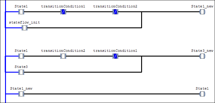 Нормально разомкнутый контакт stateflow_init закрыт. Этот контакт соответствует переходу по умолчанию.