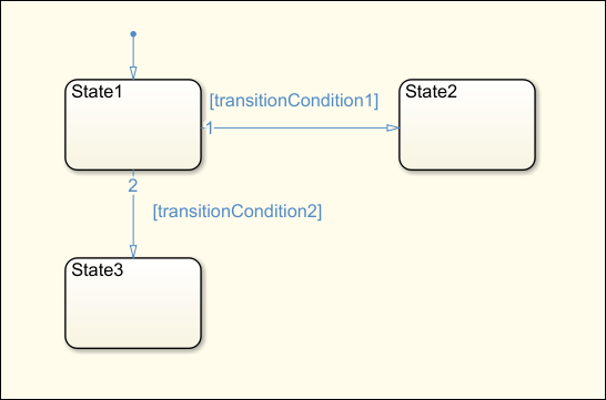 На рисунке показана простая диаграмма Stateflow с тремя состояниями и двумя переходами. На основе условий перехода диаграмма переходит из одного состояния в другое.