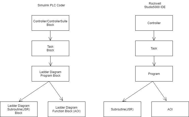 Эти блок-схемы показывают сравнение рабочего процесса на схеме многозвенной цепи, созданной Simulink ® PLC Coder™, с диаграммой многозвенной цепи, созданной в Rockwell Automation ® RSLogix™ IDE.