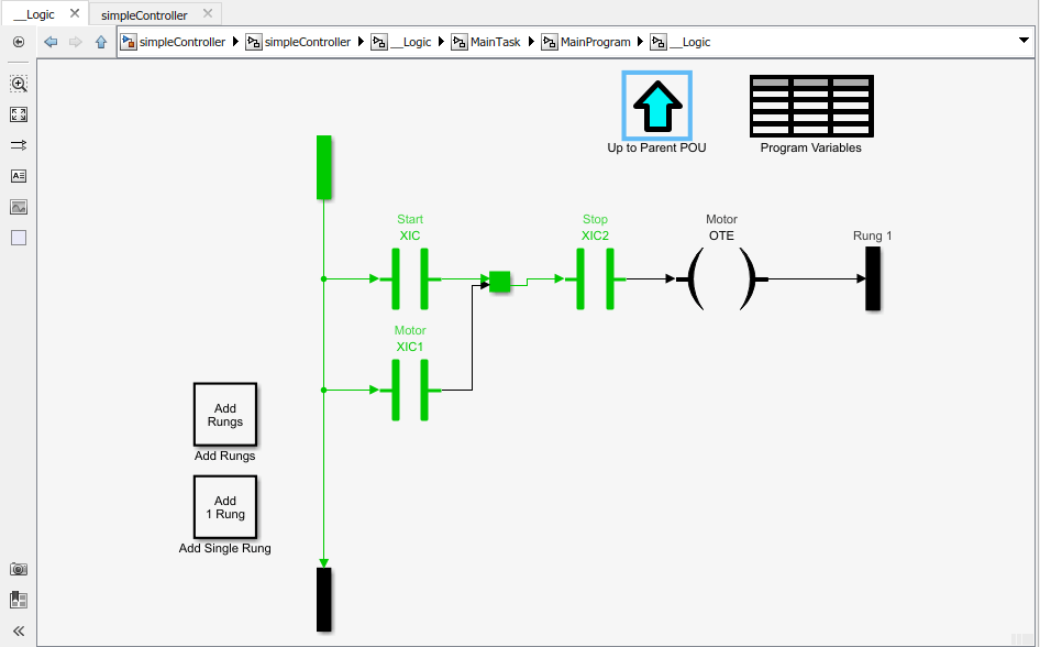 Используйте блоки XIC и Motor из библиотеки для построения простой схемы многозвенной цепи. Используйте кнопки Add Rungs или Add 1 Rung в логике лестницы, семантической, чтобы добавить новое, которому звонят. Все добавленные блоки должны находиться на ступеньке. Блок «Соединение» используется для объединения ветвей звеньев.
