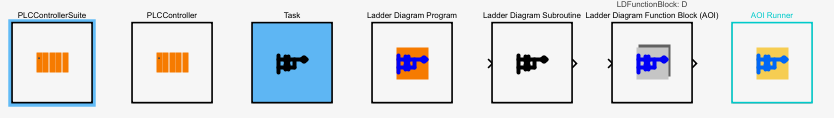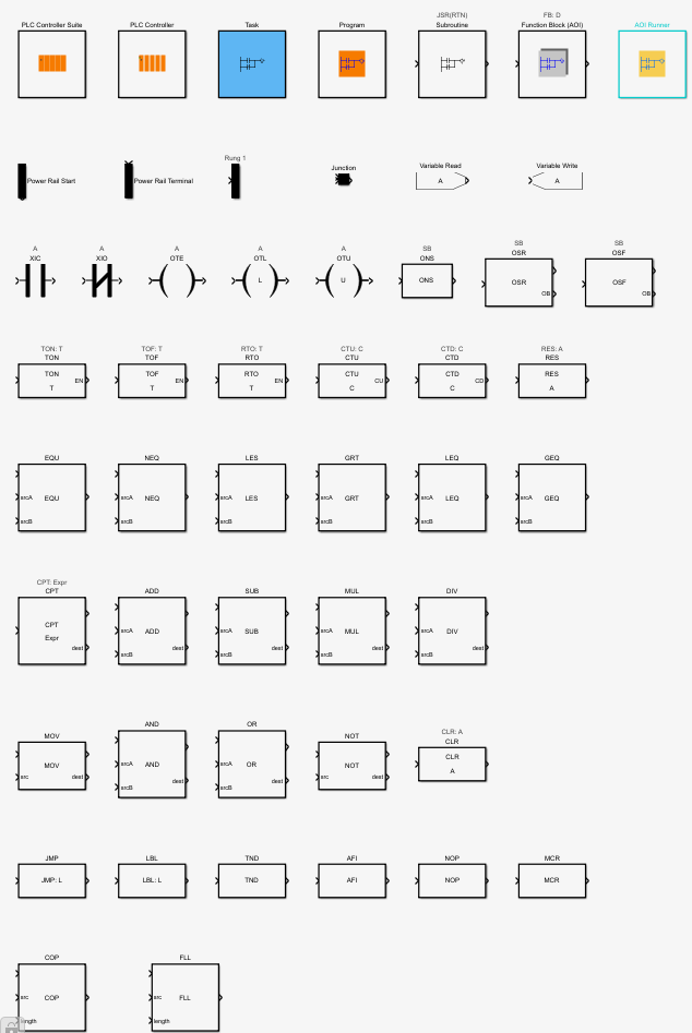 Библиотека многозвенной цепи PLC Simulink содержит логический блок многозвенной цепи верхнего уровня, такой как PLCControllerSuite, контроллер ПЛК, задача, программа многозвенной схемы, подпрограмма многозвенной схемы, функциональный блок многозвенной схемы (AOI) и AOI Runner. Все эти блоки представляют собой организационные блоки (контейнеры схемы многозвенной цепи), которые не могут находиться на ступеньках схемы многозвенной цепи. Кроме этих организационных блоков, другие блоки из библиотеки не могут быть логическими блоками многозвенной цепи верхнего уровня для моделирования.