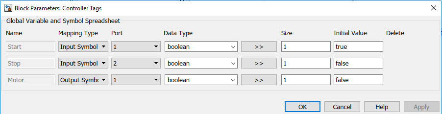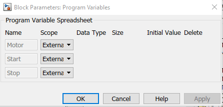 plcladderoption('simpleController','Animation','on')Подключите порты ввода и вывода к блоку PLCControllSuite, чтобы обеспечить входы для моделирования и считывания выходов. Необходимо изменить атрибуты позиционных обозначений переключателя и двигателя. Чтобы изменить атрибуты тега, откройте таблицу Переменные программы (Program Variables) в блоке Программа диаграммы многозвенной цепи (Ladder Diign Program) и задайте для них значения, показанные на рисунке.