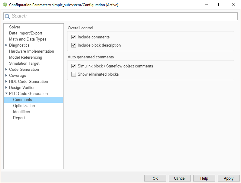 Укажите, следует ли вставлять комментарии объектов Simulink block и Stateflow ®. Эта опция доступна на панели «Создание кода ПЛК» > «Комментарии» диалогового окна «Параметры конфигурации».