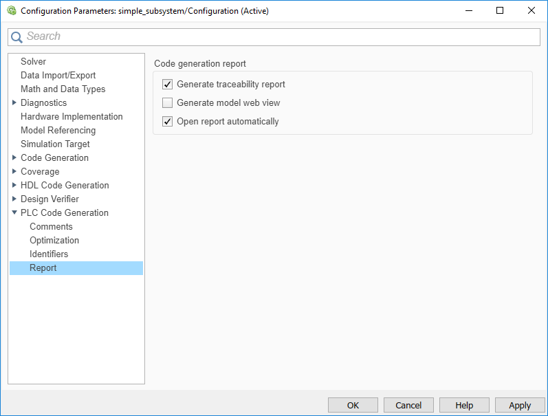 Чтобы перемещаться между кодом и моделью в одном окне, включите веб-представление модели в отчет о создании кода. Эта опция доступна на панели «Создание кода ПЛК» > «Отчет» диалогового окна «Параметры конфигурации».