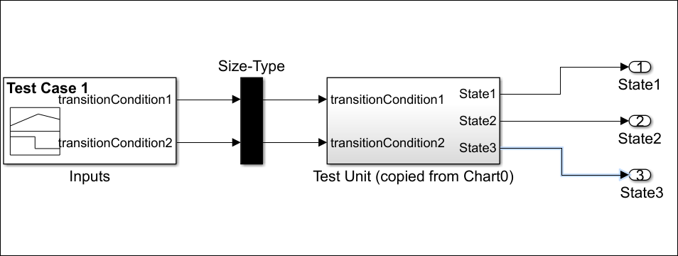 Можно также создавать тесты с помощью других блоков из библиотеки Simulink. Однако необходимо убедиться, что входные данные диаграммы являются булевыми.