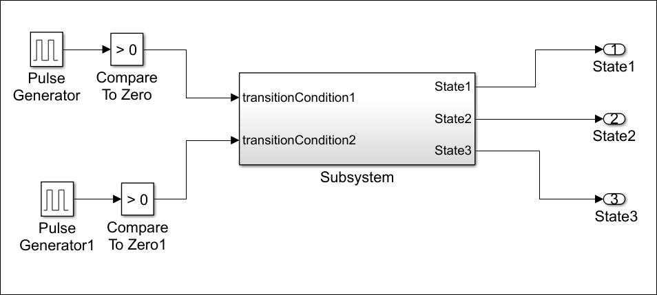 Например, на следующей диаграмме: transitionCondition1, и transitionCondition2 являются логическими входами в модель. State1, State2, и State3 соответствуют логическим выходам модели.