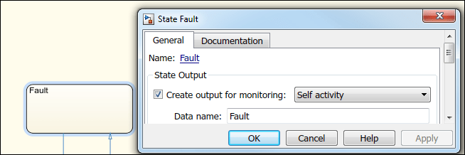 Чтобы убедиться, что каждое состояние на диаграмме сопоставлено с выводом, в диалоговом окне Свойства каждого состояния выберите Создать вывод для мониторинга. Затем выберите Self activity.