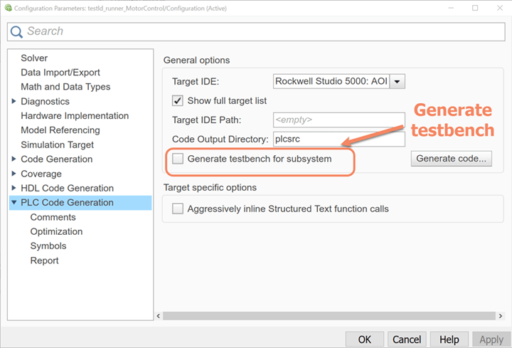 Если модель схемы многозвенной цепи создана в Simulink и создается код схемы многозвенной цепи (L5X), можно также использовать опцию «Создать тестовый стенд для подсистемы», доступную на панели «Создание кода ПЛК» в диалоговом окне «Параметры конфигурации», для создания кода стенда тестирования вместе с кодом многозвенной цепи. Если выбранной подсистемой является блок AOI Runner и включен тестовый стенд, генерируемый код будет включать тестовый стенд, выбранный AOI, а также зависимые типы AOI и UDT.