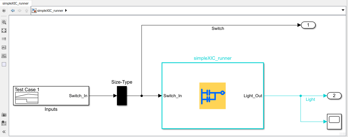 Импортированная модель содержит блок AOI Runner с именем simpleXIC_runner, за которым следует блок функции диаграммы многозвенной цепи (AOI) с именем simpleXIC.