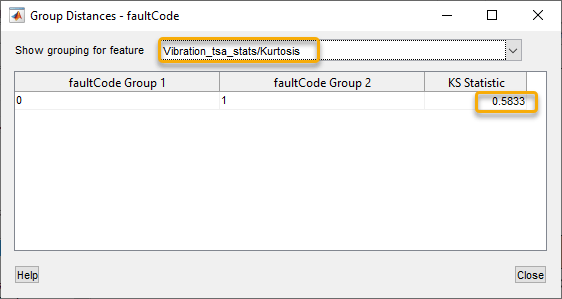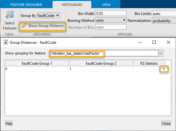 Гистограммы визуализируют способность элементов отделять здоровые от нездоровых данных. Можно также получить числовую оценку с помощью функции «Групповое расстояние». Групповое расстояние представляет разделение между здоровым и нездоровым распределением данных. Щелкните Групповое расстояние (Group Distance). В диалоговом окне выберите CrestFactor в Показать группировку для элемента.