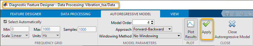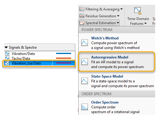 Сигнал TSA дает достаточно информации, чтобы начать генерировать функции временной области, но вы должны предоставить спектр, чтобы исследовать спектральные функции. Для генерации спектра мощности выберите новый сигнал TSA Vibration_tsa/Data в браузере данных. Затем щелкните Спектральная оценка (Spectral Estimation), чтобы вывести опции спектра. Из этих параметров выберите Autoregressive Model.