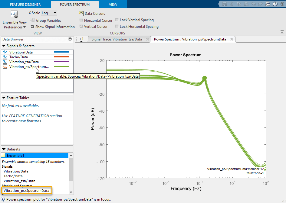 Обработка спектра мощности приводит к новой переменной, Vibration_ps/SpectrumData. Связанный значок представляет частотную характеристику.