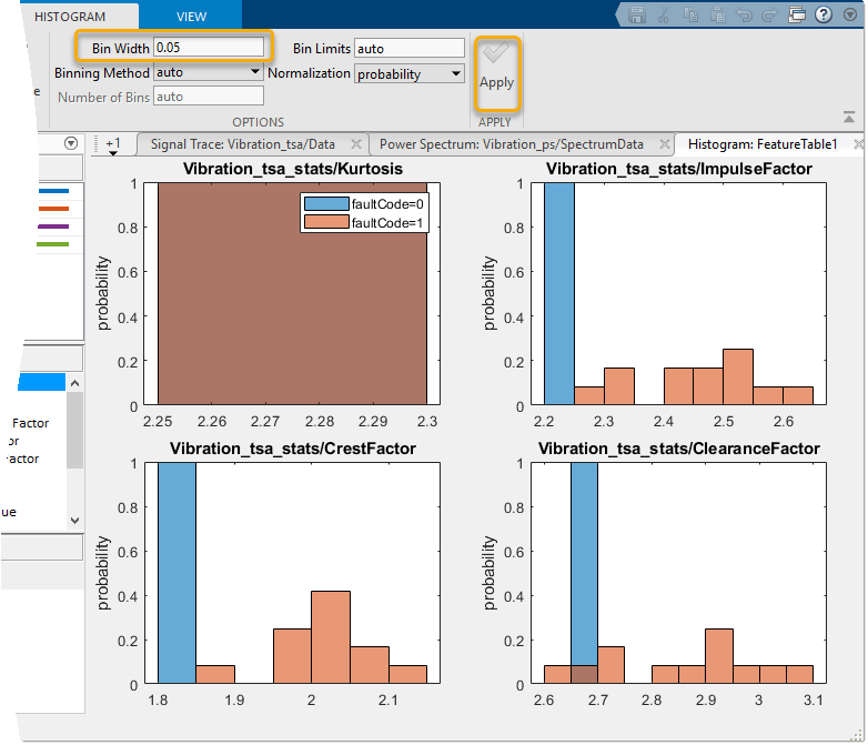 Управление внешним видом гистограмм осуществляется с помощью параметров на вкладке Гистограмма (Histogram), которая активируется при создании гистограмм. CrestFactor функция, по-видимому, почти полностью разделяет здоровые и нездоровые данные. Проверьте, чувствителен ли этот результат к разрешению. На вкладке «Гистограмма» нажмите auto установка ширины ячейки приводит к разрешению 0,1 для CrestFactor. Введите ширину ячейки 0,05 и нажмите «Применить».