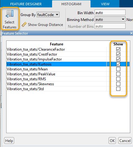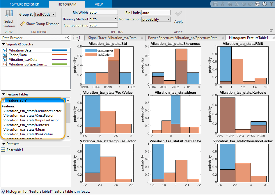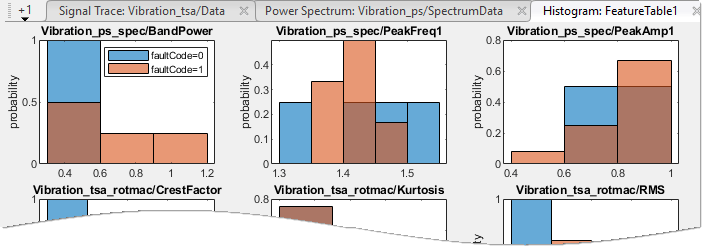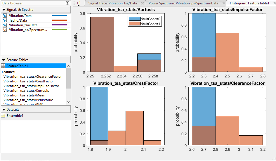 Вы можете получить приблизительное представление о том, какие функции эффективны, оценивая, какие из них явно отделяют синие данные от оранжевых. RMS и CrestFactor кажутся эффективными. Имеются лишь небольшие участки перекрытия. И наоборот, Skewness и Kurtosis имеют большое перекрытие. Эти функции оказываются неэффективными для этих данных и этой переменной условия.