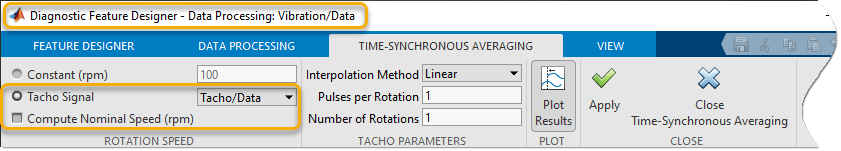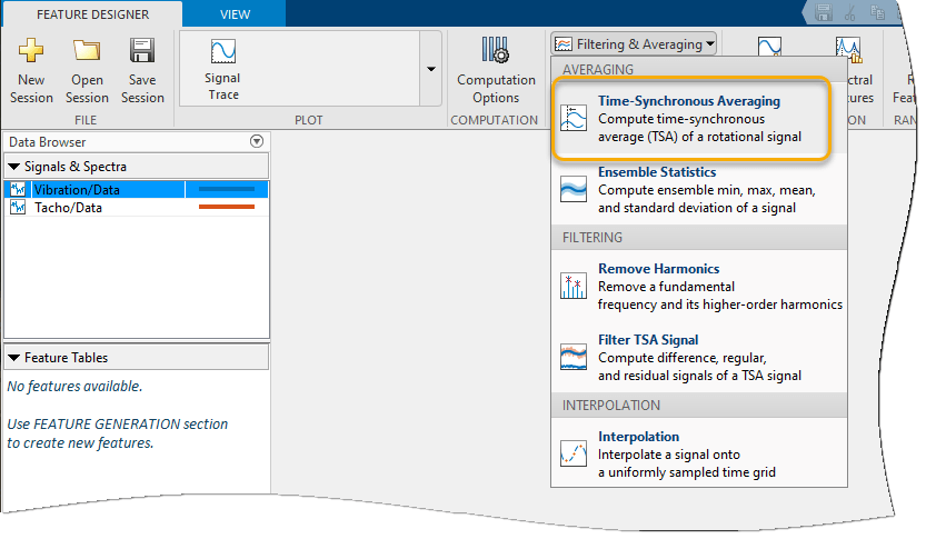 Чтобы вычислить TSA данных вибрации, сначала выберите сигнал для усреднения, Вибрация/Данные, в браузере данных. Затем выберите Фильтрация и усреднение > Синхронное усреднение времени.