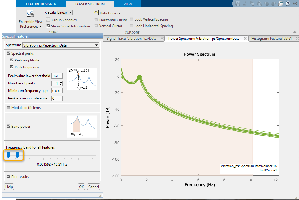 Вычислите спектральные характеристики по спектру мощности, сгенерированному ранее. Щелкните Спектральные элементы (Spectral Features). В поле «Спектр» выберите Vibration_ps/SpectrumData.