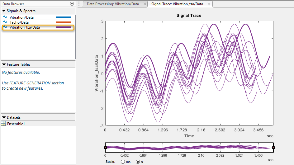 Приложение добавляет новую переменную сигнала Vibration_tsa в импортированный Ensemble1 набор данных.