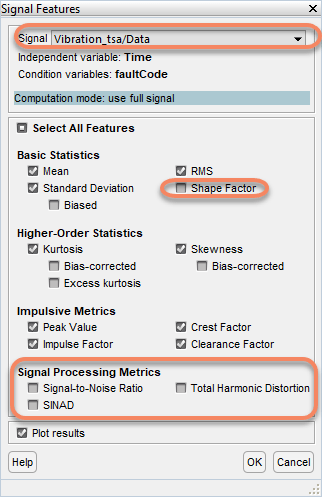 При создании элементов исходный сигнал выбирается как часть спецификации элемента, а не путем предварительного выбора исходного сигнала в браузере данных. Заменить сигнал на Vibration_tsa/Data. По умолчанию выбираются все элементы. Снимите флажки для параметров коэффициента формы и обработки сигналов.