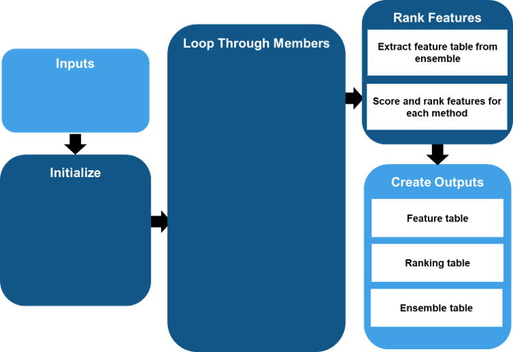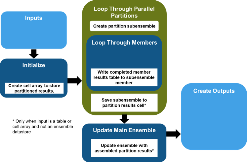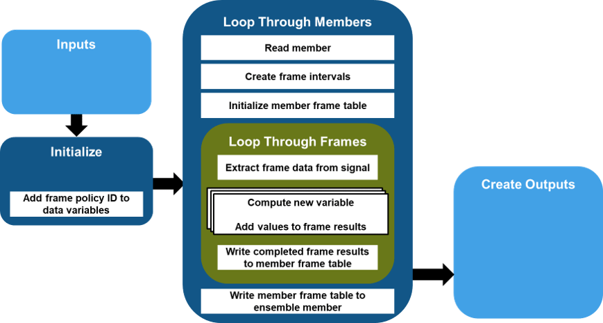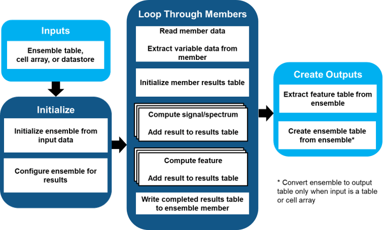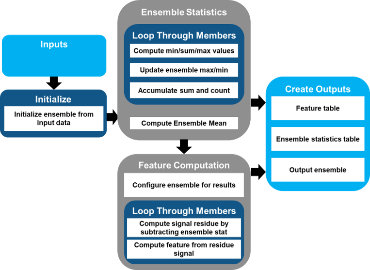 В блоке Initialize код настраивает ансамбль, который содержит переменные как для входов, так и для выходов, которые функция вычисляет в блоке Loop Through Members. Эти вычисленные выходные данные включают переменные и элементы, явно выбранные при создании кода, и любые дополнительные переменные, такие как tsa сигнал, который требуется любой из ваших функций.