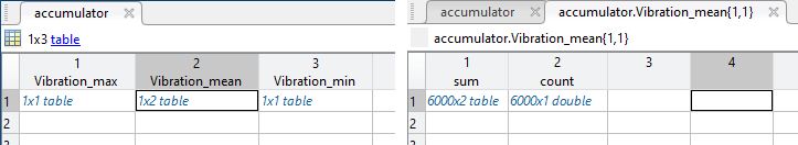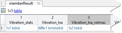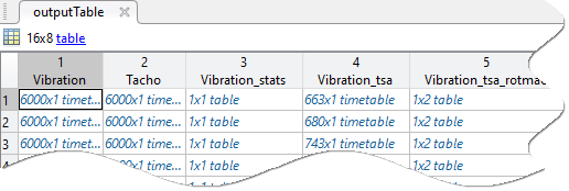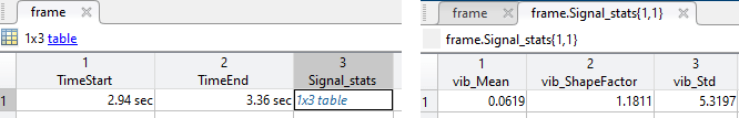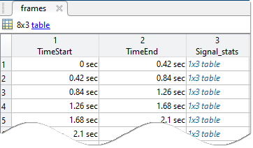 Вычисляет сигналы, спектры и признаки таким же образом, как для обработки полного сигнала на уровне элемента. После вычисления каждой новой переменной код добавляет переменную к таблице результатов кадра. На рисунке показан пример таблицы рамок элементов. Первые два элемента содержат время начала и окончания интервала кадра. Последний элемент содержит элементы, вычисленные для этого кадра.