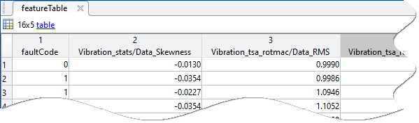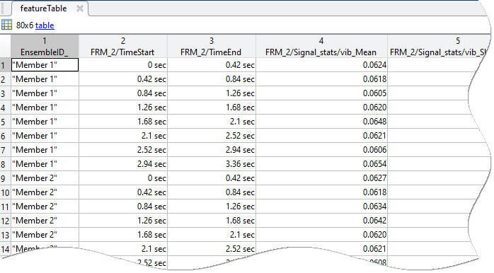 Основным выходом сгенерированной функции является таблица признаков, которую код извлекает с помощью функции. readFeatureTable. Эти выходные данные совпадают независимо от того, используется ли в качестве входных данных ансамбль рабочей области или хранилище данных ансамбля. Таблица элементов содержит сами скалярные элементы, а также переменные условия.