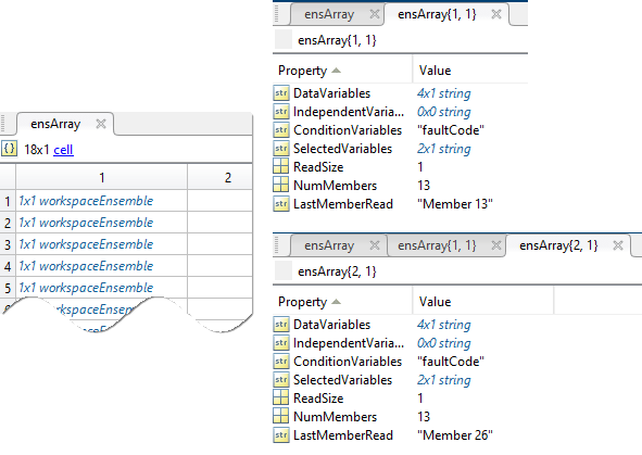 Если основным ансамблем является workspaceEnsemble объект, затем в конце каждого цикла обработки секционирования код сохраняет обновленный подсборку в виде ячейки в массиве, который сохраняет результаты для всех подсистем. На следующем рисунке показан пример этого массива вместе с первыми двумя ячейками. На этом рисунке каждый раздел содержит 13 элементов.