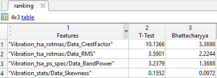 Для инициализации ранжирования код извлекает значения признаков и метки (значения переменных условий) из таблицы признаков. Затем код определяет группы классов путем преобразования меток в числовые значения с помощью функции grp2idx назначение индекса группы каждой функции. Например, если переменная условия FaultCode имеет метки "Faulty", "Degraded", и "Healthy", grp2idx группирует элементы с этими метками в группы 1, 2 и 3.