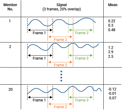 Например, предположим, что у вас есть ансамбль из 20 вибрационных сигналов, и каждый сигнал имеет длину не менее 100 секунд. При вводе размера кадра (FS) в качестве 50 секунды и частота кадров (FR) как 40 секунды, каждый сигнал содержит, по меньшей мере, три кадра: