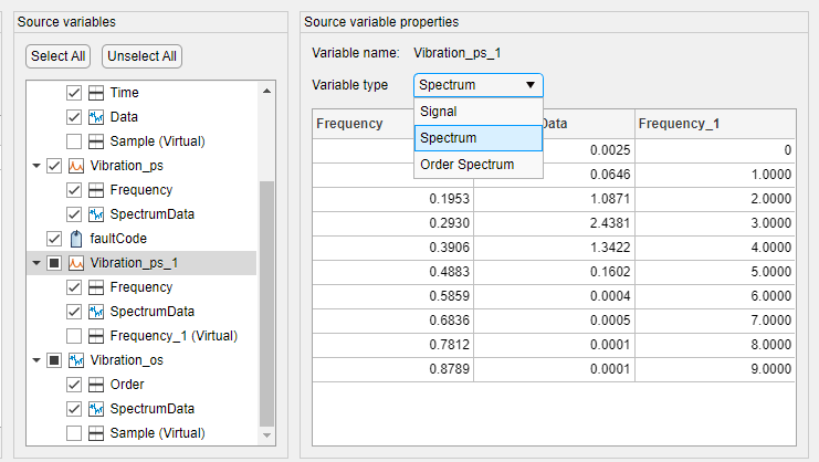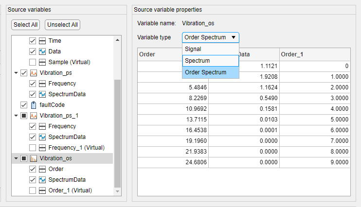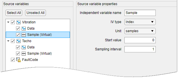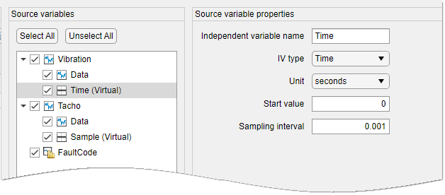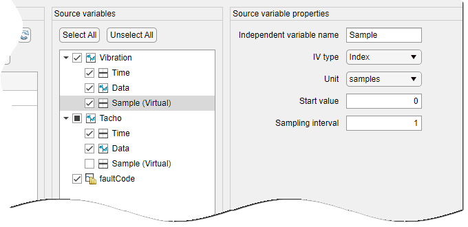 Инициируйте импорт и выберите данные для импорта. В разделе Исходные переменные выберите Sample (Virtual) и просмотрите свойства. На следующем рисунке показан этот шаг. На этом рисунке Vibration теперь выбраны все три переменные нижнего уровня. В разделе Свойства переменной источника отображаются типы и единицы измерения IV по умолчанию для Sample (Virtual), которые являются индексом и выборками соответственно. Обратите внимание, что на рисунке также показан флажок выбора для Vibration но заполненное поле выбора для Tacho. Разница в том, что Tacho содержит переменную нижнего уровня, которая не выбрана.