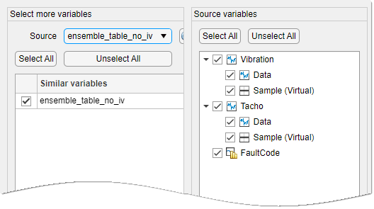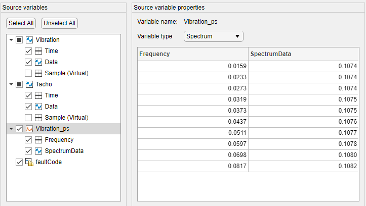 В разделе Исходные переменные отображаются переменные из ансамбля. На следующем рисунке приложение идентифицирует Vibration и Tacho переменные как сигналы, основанные на времени, каждый из которых содержит Time и Data переменные. Третья переменная в наборе переменных для каждого сигнала, Sample (Virtual), не проверяется. Sample (Virtual) позволяет создать IV, особенно если исходный набор данных не содержит явного IV. Для получения дополнительной информации о Sample (Virtual), см. Импорт сигнала без временной переменной.