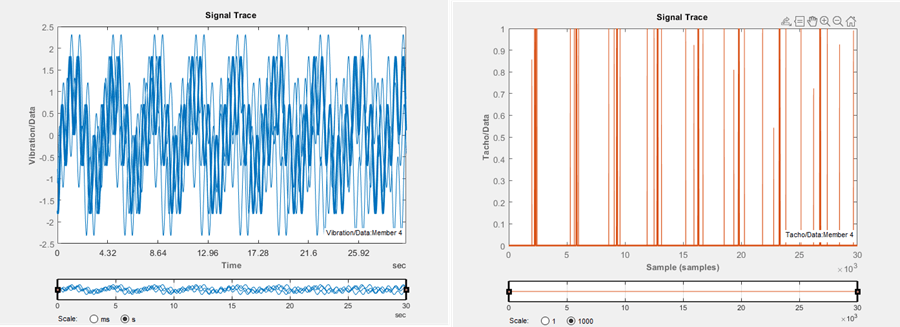 После восстановления требуемых IVs завершите процесс импорта. Для просмотра восстановленных временных шкал выполните печать импортированных сигналов в приложении. На следующем рисунке показаны графики для Vibration, которая имеет восстановленную временную шкалу, и Tacho, который сохраняет значение по умолчанию IV Sample.