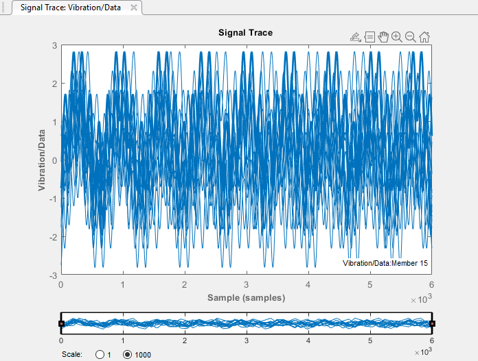 Выбрать Vibration/Data и щелкните Трассировка сигналов (Signal Trace), чтобы построить график данных и просмотреть импортированные сигналы, как показано на следующем рисунке. Дополнительные сведения о печати данных см. в разделе Импорт и визуализация данных ансамбля в конструкторе диагностических элементов.
