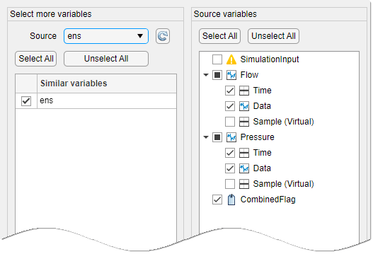 Инициируйте процесс импорта и выберите хранилище данных ансамбля. Приложение интерпретирует типы переменных с помощью свойств хранилища данных ансамбля для SelectedVariables, DataVariables, IndependentVariables, и ConditionVariables. На рисунке примера показан импорт simulationEnsembleDatastore объект ens.
