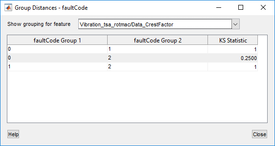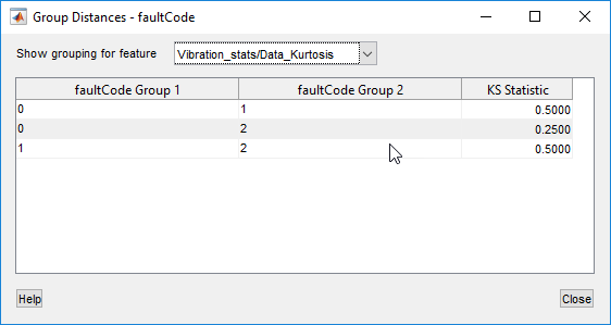Статистика KS показывает разделение между каждым спариванием faultCode значения. Статистическое значение находится в диапазоне от 0 до 1, где 0 - отсутствие разделения между распределениями, а 1 - полное разделение.