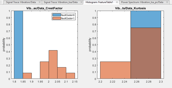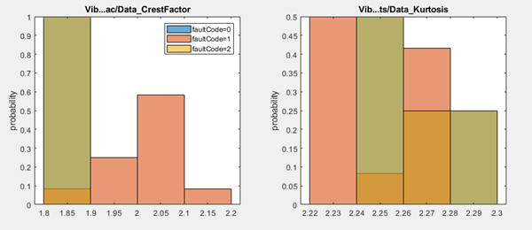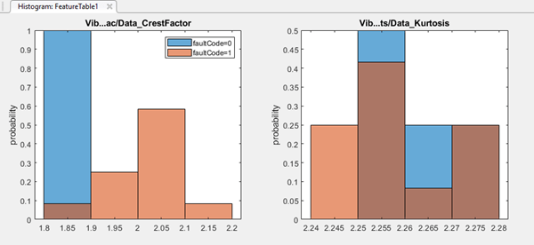 На обоих участках код состояния двух состояний faultCode. Значение 0 (синий) указывает на исправную систему, а значение 1 (оранжевый) - на неисправную систему. Гистограммы представляют фактор гребня и куртоз Vibration сигнал.